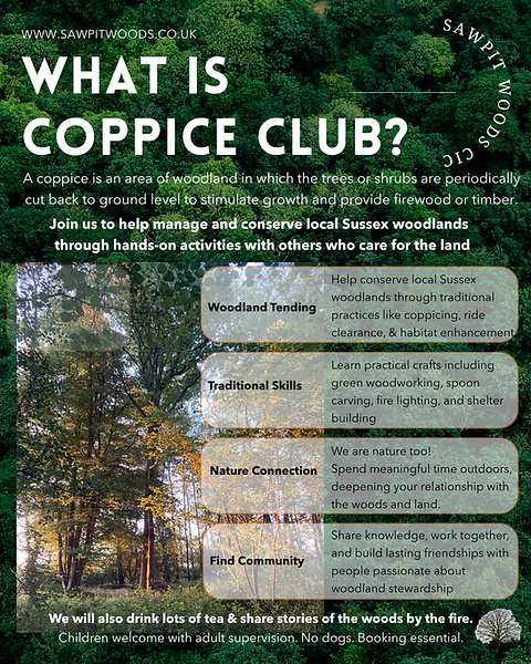 🌳 Coppice Club is our new offering, inviting people to come together in local woodland to tend, share, develop skills and connect with each other and the woods.